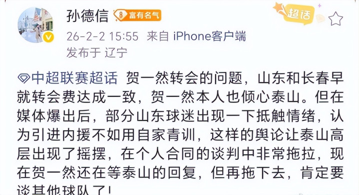 不过,计划赶不上变化。就在大家以为这桩转会交易板上钉钉的时候,近期有博主却爆料贺一然的转会陷入了停滞。原来,不少山东泰山球迷认为,与其引进贺一然,不如重点培养自家的青训球员,只要给予充足出场机会,史松宸的实力未必不及贺一然。受这种外部舆论影响,泰山俱乐部在引援决策上开始陷入摇摆状态:一方面,后防线的困境迫切需要引援补强,贺一然的能力与潜力符合球队需求;另一方面,外部球迷情绪、过往多笔引援失败带来的舆论压力,让俱乐部高层顾虑重重、犹豫不决。